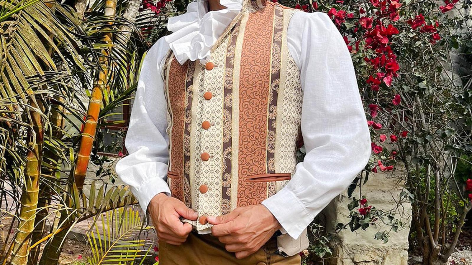 En cuanto al diseño del vestuario de los señores, se pueden resaltar los colores claros, principalmente blanco y crema para camisas; y cuello y puños con muchos vuelos, además de chalecos con diseños y estampados, donde predominan las flores y los botones forrados con dibujos.