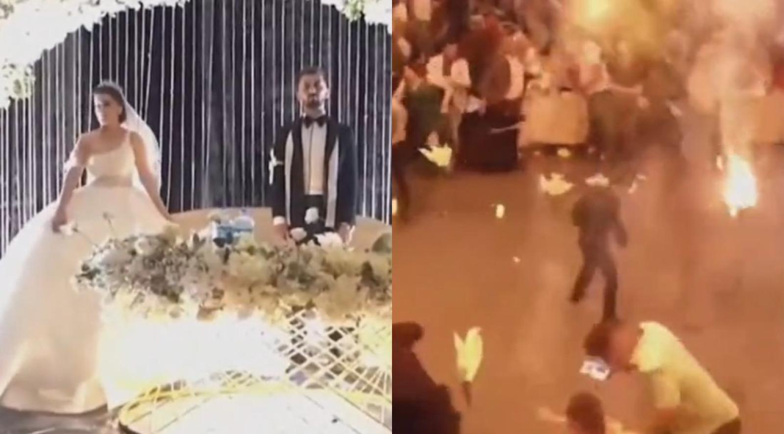 Es ahí cuando el techo empieza a incendiarse y a botar escombros, sembrando el pánico tanto de los asistentes como de los recién casados, que rápido se alejaron para protegerse de las llamas.