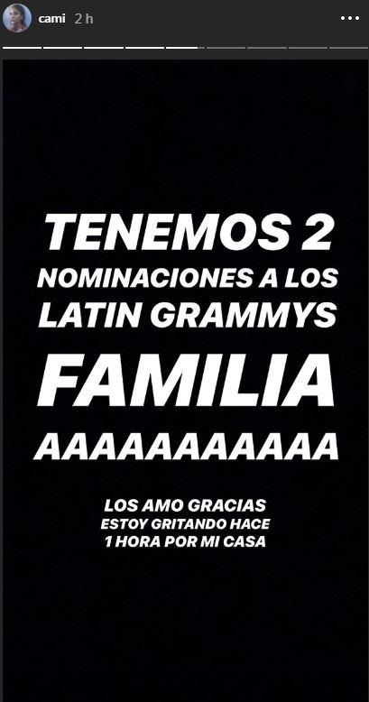 "¡Tenemos 2 nominaciones a los Latin Grammys familia! Los amo, gracias, estoy gritando hace una hora por mi casa", escribió en la red social.