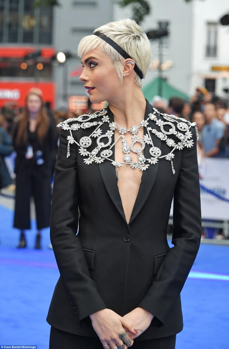 Cara Delevingne se lució en la premiere de "Valerian And The City Of A Thousand Planets" con un traje Burberry y encima una collar-capa de brillantes que sin duda le otorgó aún más status.
