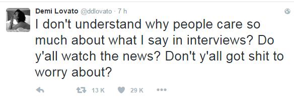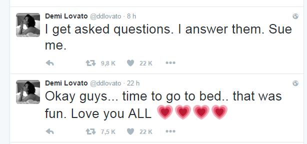 Tras la publicación de la entrevista, Demi no se arrepintió de sus comentarios, e incluso los reafirmó con dos mensajes.“Me hacen preguntas. Las respondo. Demándenme”, dijo en uno de los mensajes. “Además no olviden que las palabras pueden ser sacadas de contexto en las entrevistas… pero no me voy a disculpar por decir lo que todos piensan”.