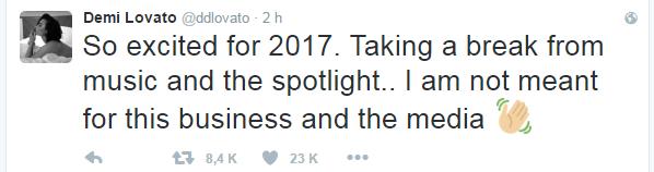 “Emocionada por el 2017. Me tomaré un descanso de la música y de los focos… No estoy hecha para este negocio y los medios”, escribió en Twitter la intérprete de “Heart Attack” ante la sorpresa de sus millones de seguidores, que le pedían que no los abandonara.