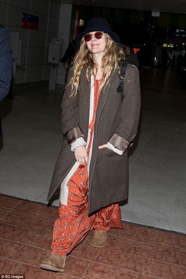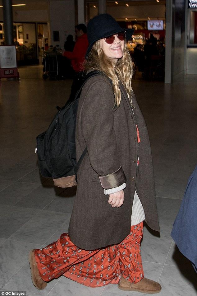 Un maxi vestido, unas botas Ugg, un abrigo, un sweater de lana debajo, un sombrero y anteojos se puso Drew Barrymore encima.