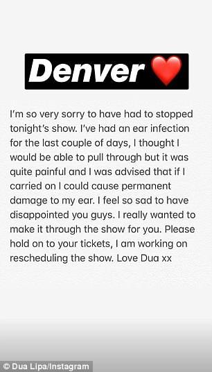 Posterior al recital frutrado, Dua se expresó en redes sociales volviéndose a disculpar. "He tenido una infección en el oído durante los últimos días, pensé que sería capaz de salir adelante, pero fue bastante doloroso y me advirtieron que si continuaba podría causar un daño permanente en mi oído", dijo.