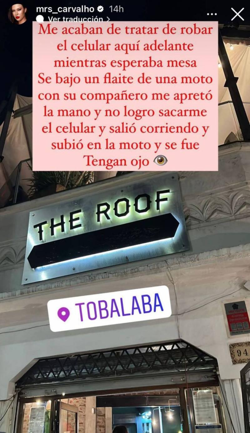 En una foto que compartió en sus historias de Instagram, Michelle sostuvo que "me acaban de tratar de robar el celular aquí delante mientras esperaba una mesa”.