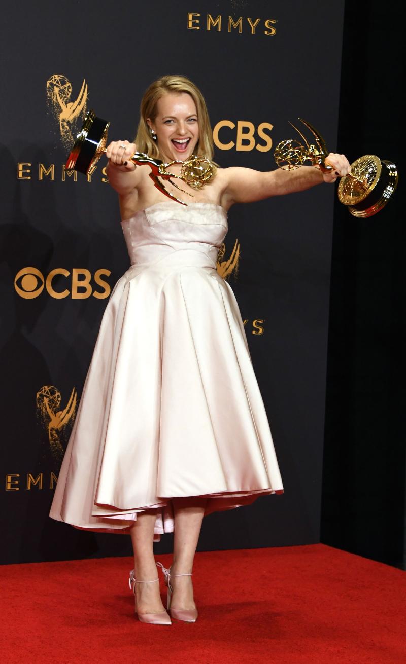 Elisabeth Moss, quien ganó el premio como mejor actriz dramática por su papel en la distópica serie "The Handmaid's Tale", vistió un claro vestido retro que a muchos los transportó a la época de "Mad Men", serie ambientada en los 60 y que la lanzó al estrellato.
