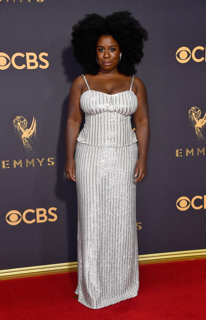 Y su compañera en este drama presidiario, Uzo Aduba, exhibió su voluptuosa figura en un traje de dos piezas con rayas plateadas y blancas.