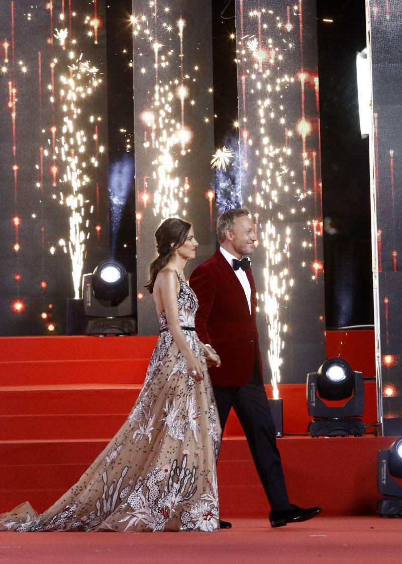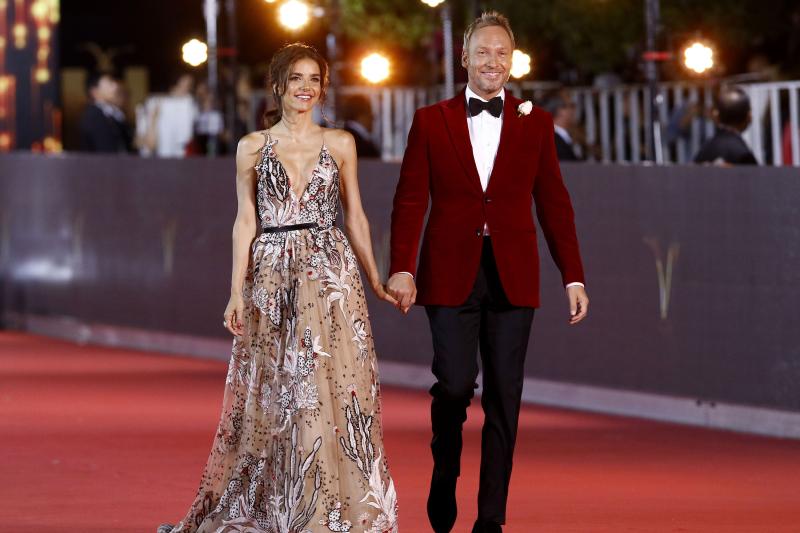 La animadora lució un vestido nude con bordados y aplicaciones en blanco, negro y rojo del diseñador Zuhair Murad. En tanto, Martín Cárcamo vistió un traje de Sergio Arias con una llamativa chaqueta roja.