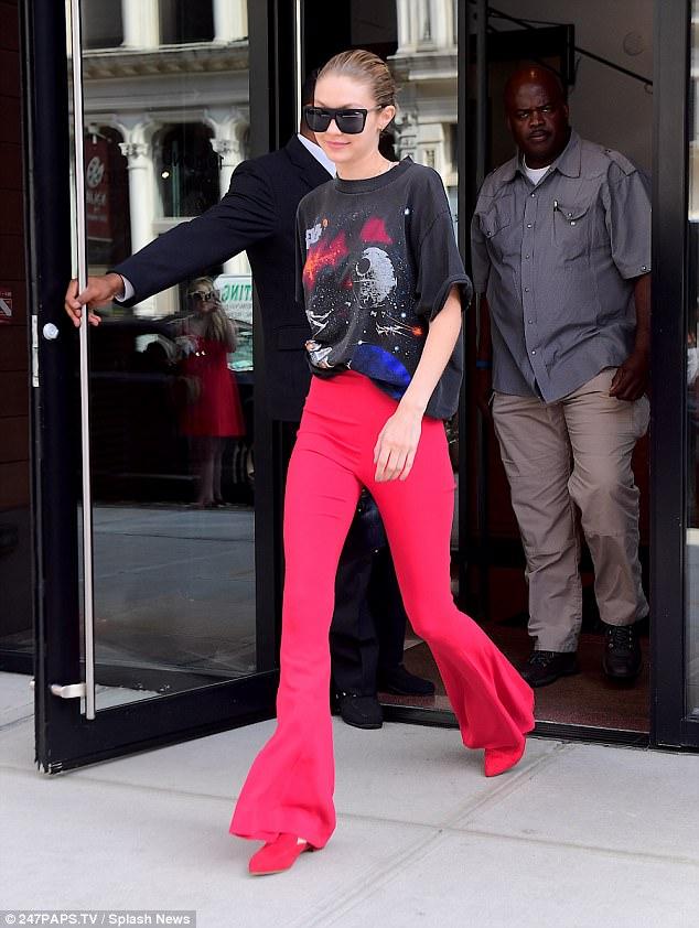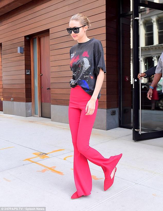 Ahora la celebridad se dejó ver en un pantalón flare ajustado con el color de la temporada, el fucsia. Acompañada a la prenda del momento una polera gráfica de algodón le pone un toque urbano totalmente chic.