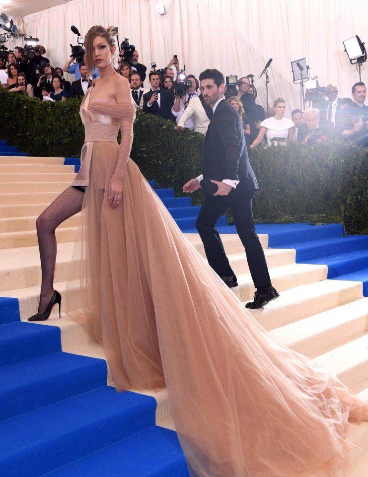 De tono nude en su tonalidad más dorada y mezclando texturas entre opacas, brillosas y tul, Hadid se lució por la alfombra roja posando con una de sus piernas a la vista, mostrando así una media liga negra.