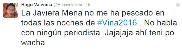 “La Javiera Mena no me ha pescado en todas las noches de #Viña2016. No habla con ningún periodista. Jajajaja ahí teni po wacha (sic)”, escribió el panelista luego de la cuestionada actuación de la artista.