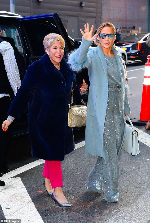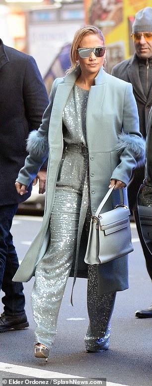 En este caso se trató de un outfit que jugó con el tono celeste pastel de pies a cabeza. JLO llevó en las calles de Nueva York un enterito glitter, un abrigo recto a tono con pelos en los puños y un bolso grande "de oficina".