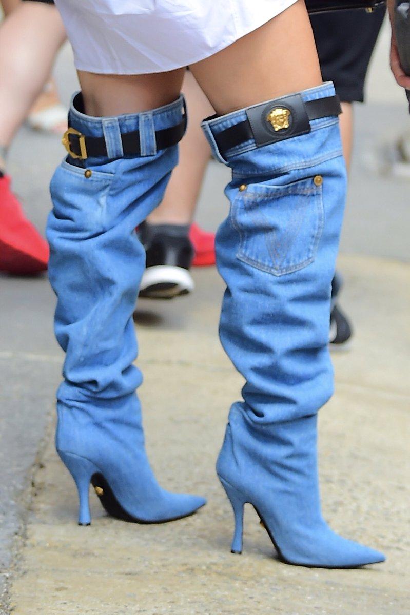 La intérprete de “El anillo” apareció con una camisa blanca y un par de botas Versace que simulaban un jeans… ¡Incluso tienen correa y bolsillos! Para complementar su aplaudido look, la también actriz se recogió el cabello con una cola alta y utilizó uno que otro accesorio.