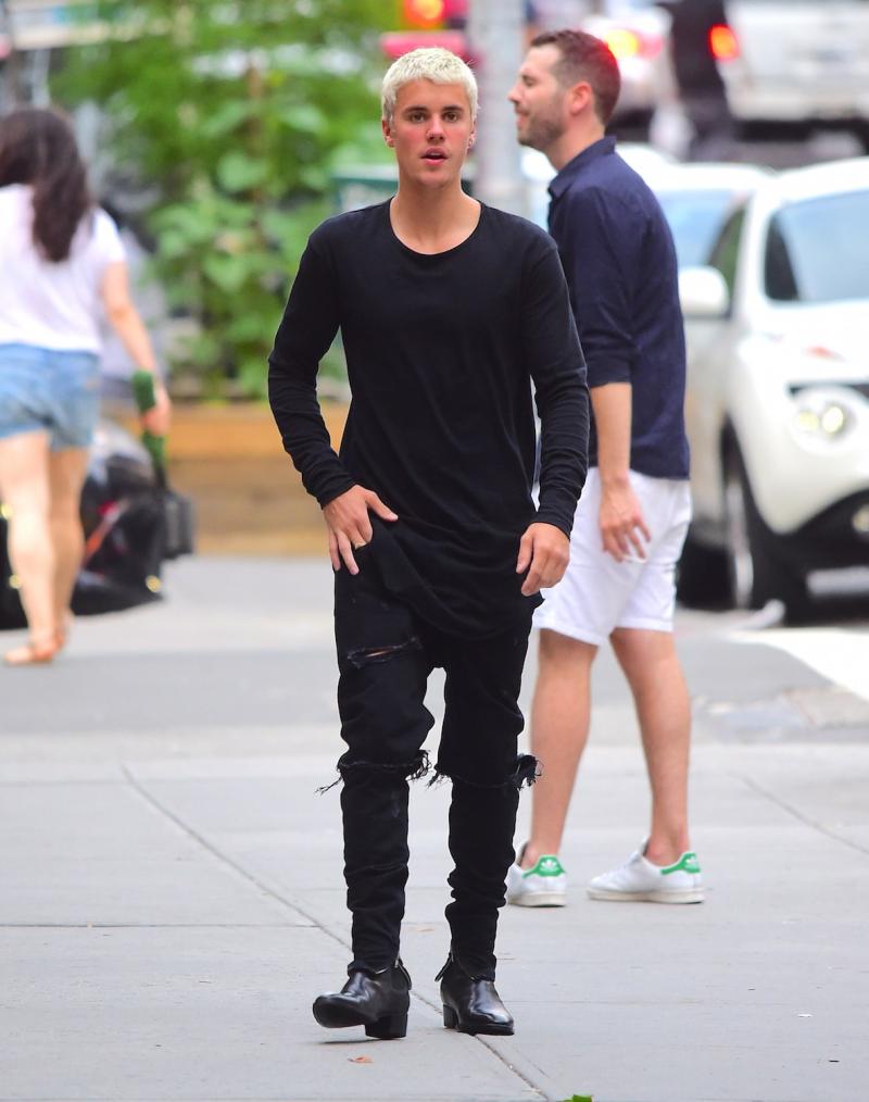 Vestido totalmente de negro, Justin terminó el vestuario con unas botas con algunos centímetros de taco alto de la última colección de Yves Saint Laurent, que lo hacían ver más estilizado.