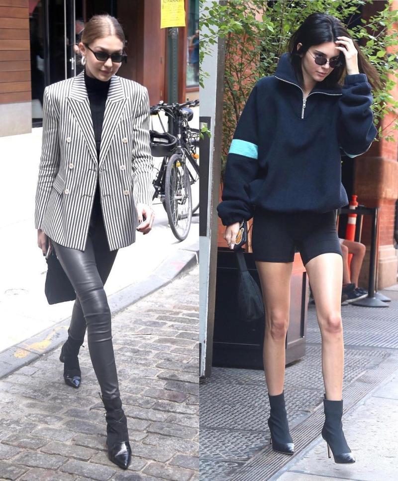 A su lado, Gigi Hadid lleva el mismo zapato, con cordones, calzas de cuero, un beatle negro y encima un blazer de líneas.
