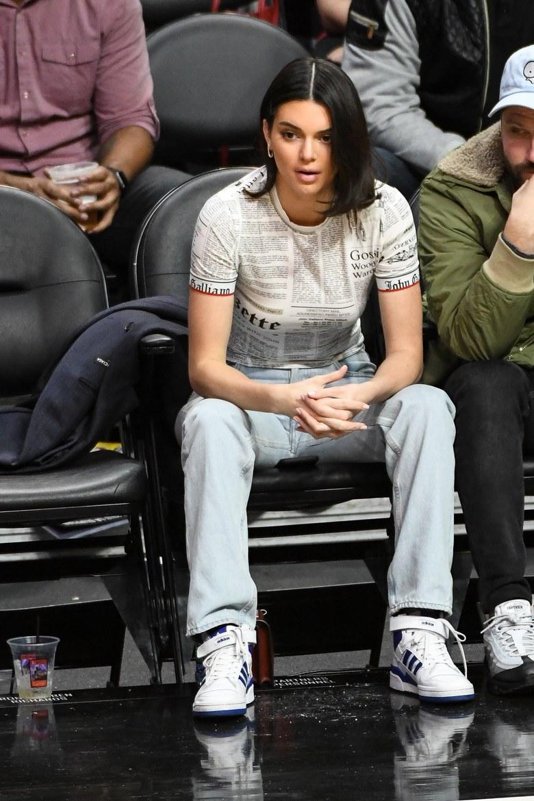 Newspaper print, el osado look de Kendall Jenner a la hora de presenciar un concurrido partido de baloncesto llamó la atención de los presentes.