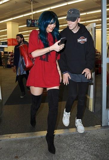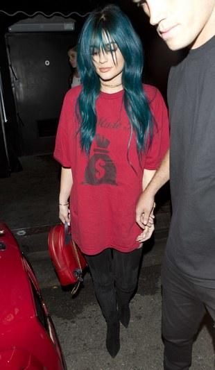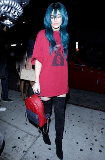 Además de romper las reglas y salir sin pantalones, o usar un top como vestido, Kylie se puso unos zapatos totalmente invernales en pleno verano. El look lo acompañó con el pelo azul, y una pequeña mochila de cuero.