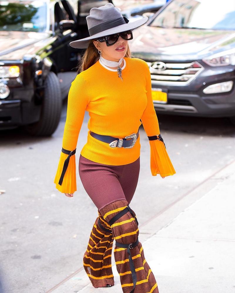 ¿Sado chic? Unas amarras extrañas lució la celebridad, encima de un outfit colorido y original.