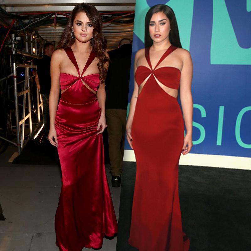 Pese a que el vestido de la integrante de Fifth Harmony es matizado y el que uso Selena es satinado, el modelo parece ser el mismo.