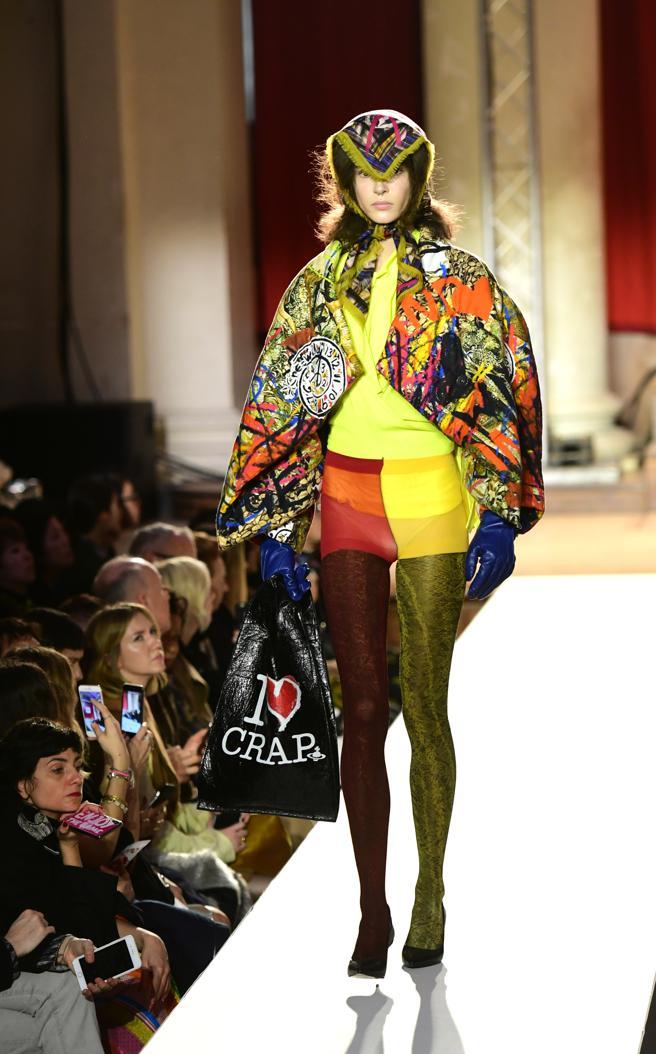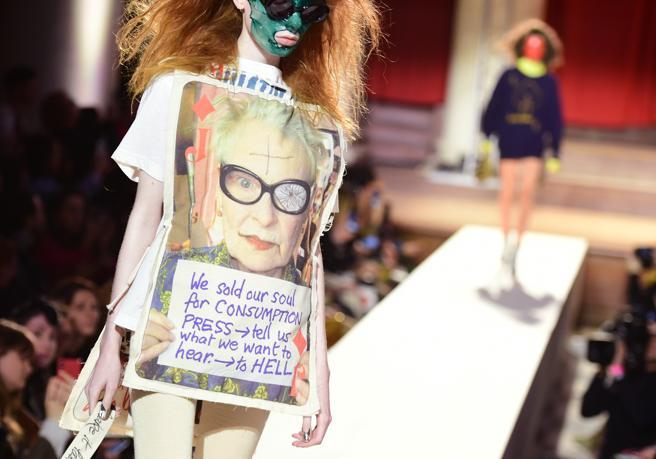 “Vendimos nuestra alma por el consumo de la prensa, dinos qué queremos oír, al infierno”, se lee en una de las poleras de la autoría de la diseñadora británica.