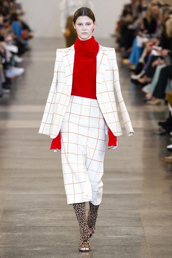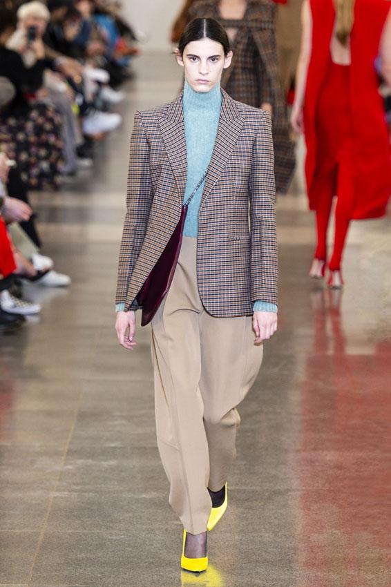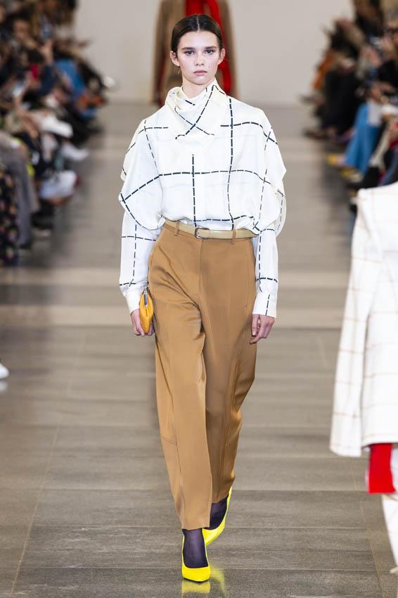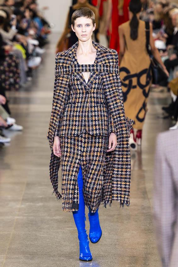 Guiños al armario masculino, vestidos trapecio y estampados de cuadros describen la composición de sus piezas.