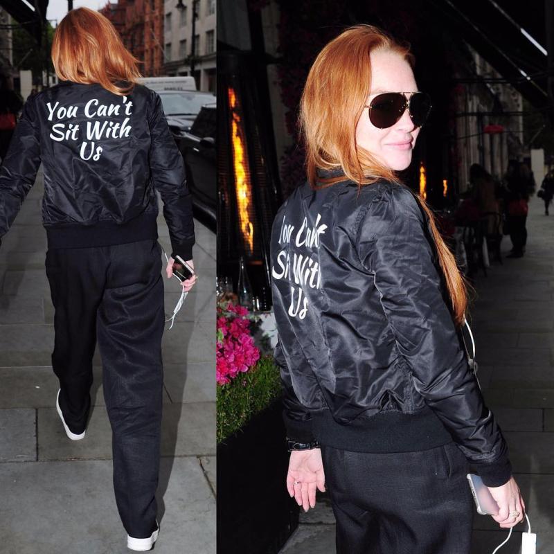 "You Can't Sit With Us", tal cual. Así Lindsay Lohan customizó una bomber jacket negra, toda una forma de darle personalidad a una prenda clásica y hasta aburrida.