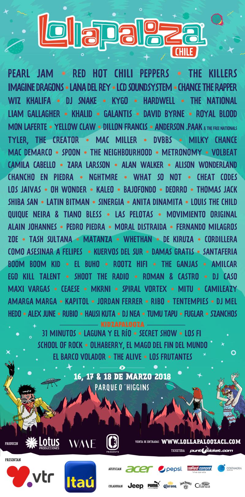 Pearl Jam, una de las bandas más legendarias e influyentes de los últimos 30 años, regresa a Parque O’Higgins luego de protagonizar el 2013 una de las presentaciones más apabullantes que han pasado por la edición nacional del festival. Los californianos Red Hot Chili Peppers vuelven con su onceavo álbum de estudio bajo el brazo, “The Getaway”, que les ha valido sus mejores críticas en más de una década. Otro número mayor son los multi-premiados The Killers, una de las bandas más representativas del rock actual y que también es parte grande de la historia de Lolla Chile, habiendo sido el plato principal de la primera edición.