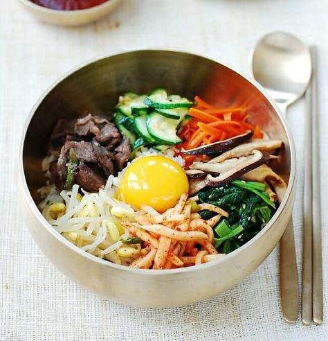 Además, se agrega champiñones, brotes de soja cocinados en agua y aceite de sésamo. Para finalizar la receta, se pone un huevo frito o una yema cruda, carne de vacuno (aunque esta puede ser eliminada para una opción vegetariana) y la salsa picante gochujang de pimentón rojo.