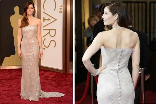 Otro vestido del grupo de los 100 dólares es este diseño de Chanel que Jessica Biel usó en 2013. El traje nude con toques metálicos llevaba la atención a la espalda, ya que tenía una línea de botones de plata que combinaban con el vestido.