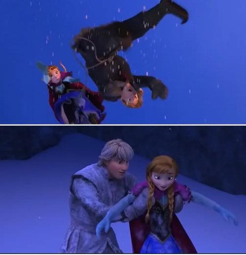 En la escena que Kristoff y Anna caen por el vacío, traen cada uno una cuerda atada, luego en la siguiente escena ¡Plop! No está ¿Será la magia Disney?