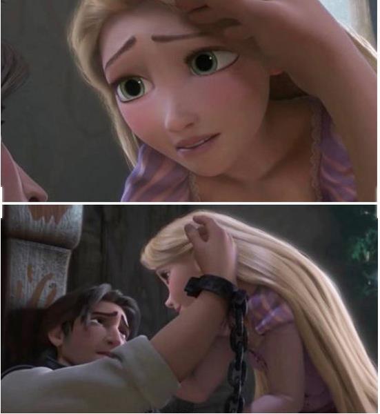 En la triste escena donde Flynn (O Eugene) le acaricia el cabello a Rapunzel se le va la cadena que tenía en su mano