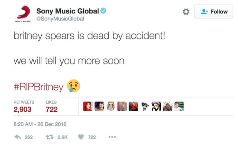 6. Britney Spears: el día 26 de diciembre del 2016, todos los fanáticos de la diva del pop quedaron impactados al leer la noticia de que había muerto en un accidente. Afortunadamente se trataba de una broma por parte de un cibercriminal que utilizó el hashtag #RIPBRITNEY para difundir la falsa noticia por medio de la cuenta de Twitter de la discografía de Sony.