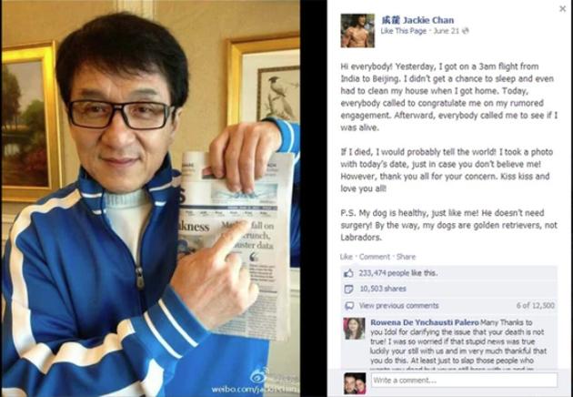 4. Jackie Chan: en el 2011, el actor se convirtió en protagonista en las redes sociales durante varios días por una noticia falsa sobre su muerte. Fue tanto la polémica que provocó este anuncio en Twitter que el propio protagonista de “Una pareja explosiva” tuvo que desmentir este rumor a través de su página de Facebook. El chisme aseguraba que había muerto de un ataque al corazón en Los Ángeles e incluso incluía un mensaje de condolencia de Barack Obama, a quien se le atribuía la frase “él siempre estará en nuestros corazones”.