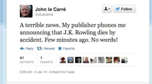 10. J.K Rowling: la autora de la saga de Harry Potter no se salvó de su muerte en Twitter. El encargado de anunciar esta noticia fue el también novelista John Le Carré pero este resultó ser un perfil falso en la red social. La noticia fue titular de medios verosímiles. Después se descubrió todo y se demostró que el dueño del tweet era un italiano que quería demostrar la credulidad de la sociedad filtrando noticias falsas.