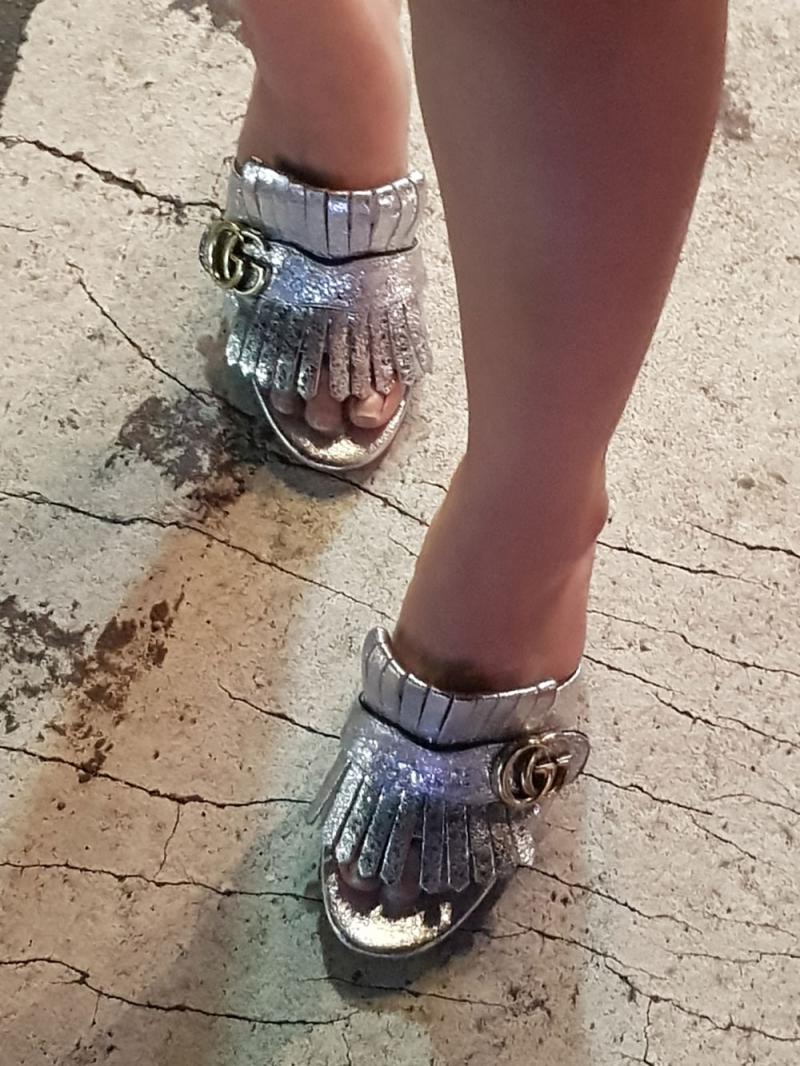 Otra formula que se repite son outfits simples en tonos neutros pero sofisticados, con un toque de tendencia de la mano de grandes marcas, como son estos mules Gucci.