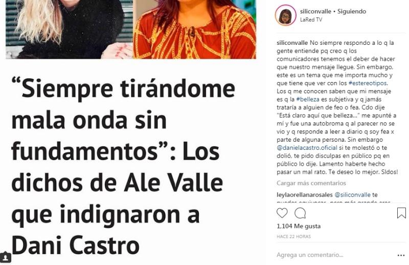 “No siempre respondo a lo que la gente entiende porque creo que los comunicadores tenemos el deber de hacer que nuestro mensaje llegue. Sin embargo, este es un tema que me importa mucho y que tiene que ver con los #estereotipos. Los que me conocen saben que mi mensaje es que la #belleza es subjetiva y que jamás trataría a alguien de feo o fea. Cuando dije "Está claro aquí que belleza…” me apunté a mí y fue una auto broma que al parecer no se vio y que responde a leer el diario que soy fea porque parte de alguna persona. Sin embargo @danielacastro.oficial si te molestó o te dolió, te pido disculpas en público porque en público lo dije. Lamento haberte hecho pasar un mal rato. Te deseo lo mejor”, redactó la periodista.