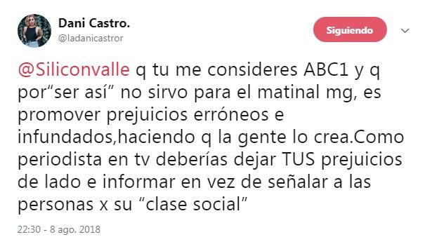 Ante esto, la ex Master Chef reaccionó furiosa en Twitter y disparó rápidamente hacia la periodista y la mandó a dejar los prejuicios de lado.