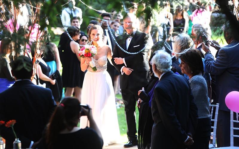 Preciosa, con un ceñido y escotado atuendo en la parte superior, que caía con sutileza y femineidad hacia abajo, la pareja se casó en el Cajón del Maipo.