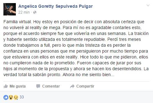 A través de su cuenta de Facebook, Sepúlveda indicó que no regresará al programa donde se reunió con Francisco Toro, su ex pareja.