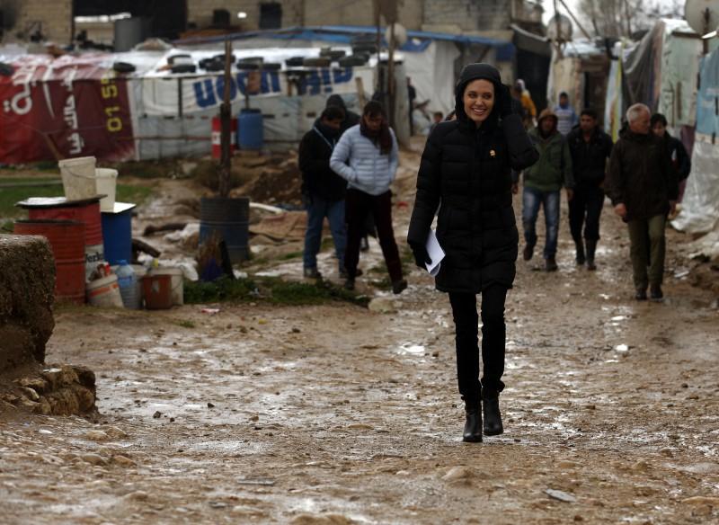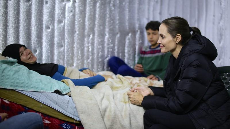 La estrella de Hollywood visitó los campos de refugiados en el valle de la Becá, en este del Líbano, donde se reunió con una mujer de 38 años paralizada desde hace tres, tras recibir un impacto de un francotirador.