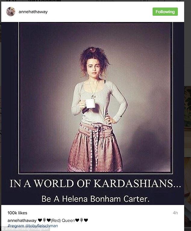 Anne Hathaway publicó en su cuenta de Instagam un meme que decía “en un mundo de Kardashians sé una Helena Bonham Carter”. Esto no le cayó bien a los fanáticos de la familia socialité y ante las críticas Hathaway tuvo que borrar su post. En el meme aparecía su colega Helena Bonham Carter, lo que hizo conlcuir a los fieles de las Kardashians que Hathaway comparaba y denostaba a sus ídolas.
