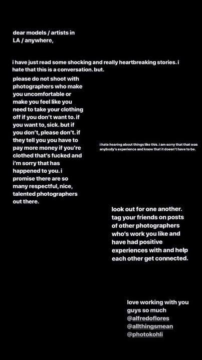 La intérprete de “7 Rings” dejó en claro que ya no tiene ningún lazo con el sujeto, y de paso condenó su actuar. “Queridos modelos/ artistas de Los Ángeles/ de cualquier lugar. Acabo de leer unos stories realmente chocantes y descorazonadores. Odio que esto sea un motivo de conversación pero por favor no hagan sesiones de fotos con fotógrafos que les hagan sentir incómodos o que les hagan sentir que tienen que quitarse la ropa si no quieren"