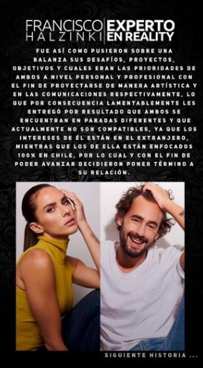 “Ambos se encuentran en paradas diferentes y que actualmente no son compatibles, ya que los intereses de él están en el extranjero, mientras que los de ella están enfocados 100% en Chile, por lo cual y con el fin de poder avanzar, decidieron poner término a su relación”, señala Francisco Halzinki, comunicador a cargo del perfil.