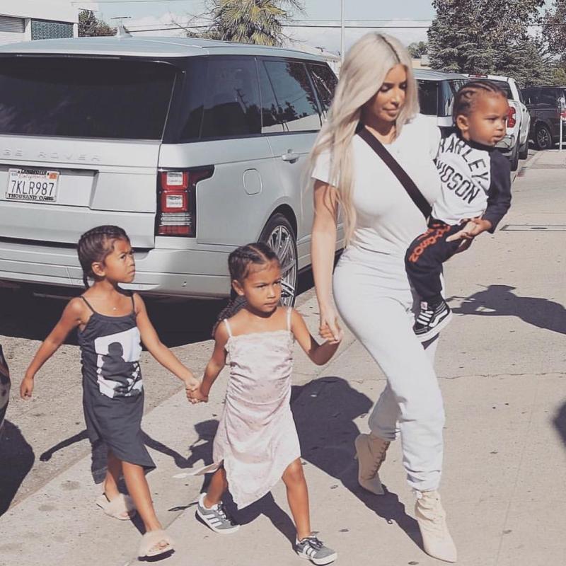 La celebridad fue fotografiada junto a North y Saint en brazos y una pequeña más que la hace ver como una madre full al cuidado de sus hijos mientras avanzan por las calles de Los Angeles.