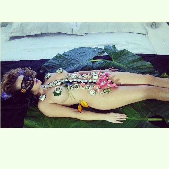 La ex chica reality sorprendió a sus seguidores luciendo sus curvas sólo tapada por la comida japonesa.
