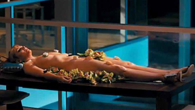 Su fotografía recuerda a una de las escenas memorables del primer filme sobre las 4 amigas de New York. Específicamente, cuando Samantha (Kim Cattrall) espera a su pareja con sushi en el cuerpo a raíz de la celebración del Día de San Valentín.