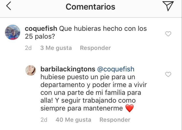 Tras conocerse el triunfo de Camila, todos nos preguntamos qué habría hecho Lackington de llevarse el gran premio de 25 millones de pesos. El usuario @coquefish aprovechó la última publicación de la joven para hacer la pregunta del millón y Barbi respondió inmediatamente.