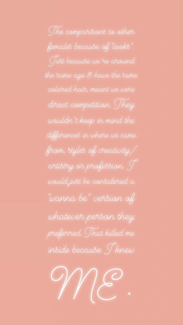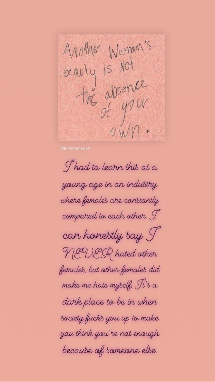 "Tuve que aprender de esto desde joven en una industria donde las mujeres son constantemente comparadas a otras. Tengo que decir honestamente que jamás he odiado a otras mujeres pero sí otras mujeres me han hecho odiarme a mi misma", escribió en Instagram.
