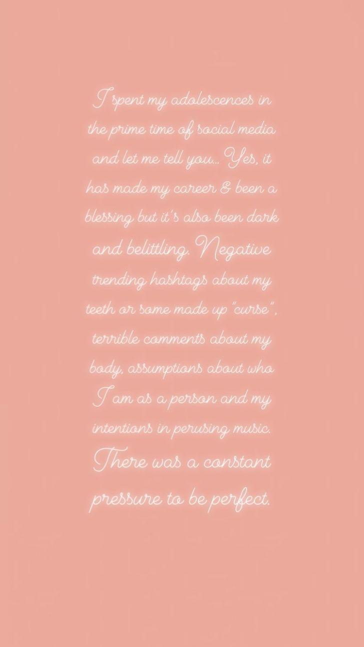 "Negativos hashtags sobre mis dientes y terribles comentarios sobre mi cuerpo, afirmaciones sobre quien soy y mis intenciones generaron en mí una cosntante presión por ser perfecta", agregó.
