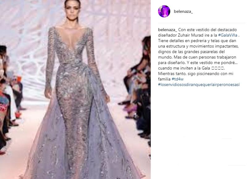 “Con este vestido del destacado diseñador Zuhair Murad ire a la #GalaViña . Tiene detalles en pedreria y telas que dan una estructura y movimientos impactantes, dignos de las grandes pasarelas del mundo. Mas de cien personas trabajaron para diseñarlo. Y este vestido me pondré... cuando me inviten a la Gala”, escribió Mora junto con subir una foto del traje en cuestión.